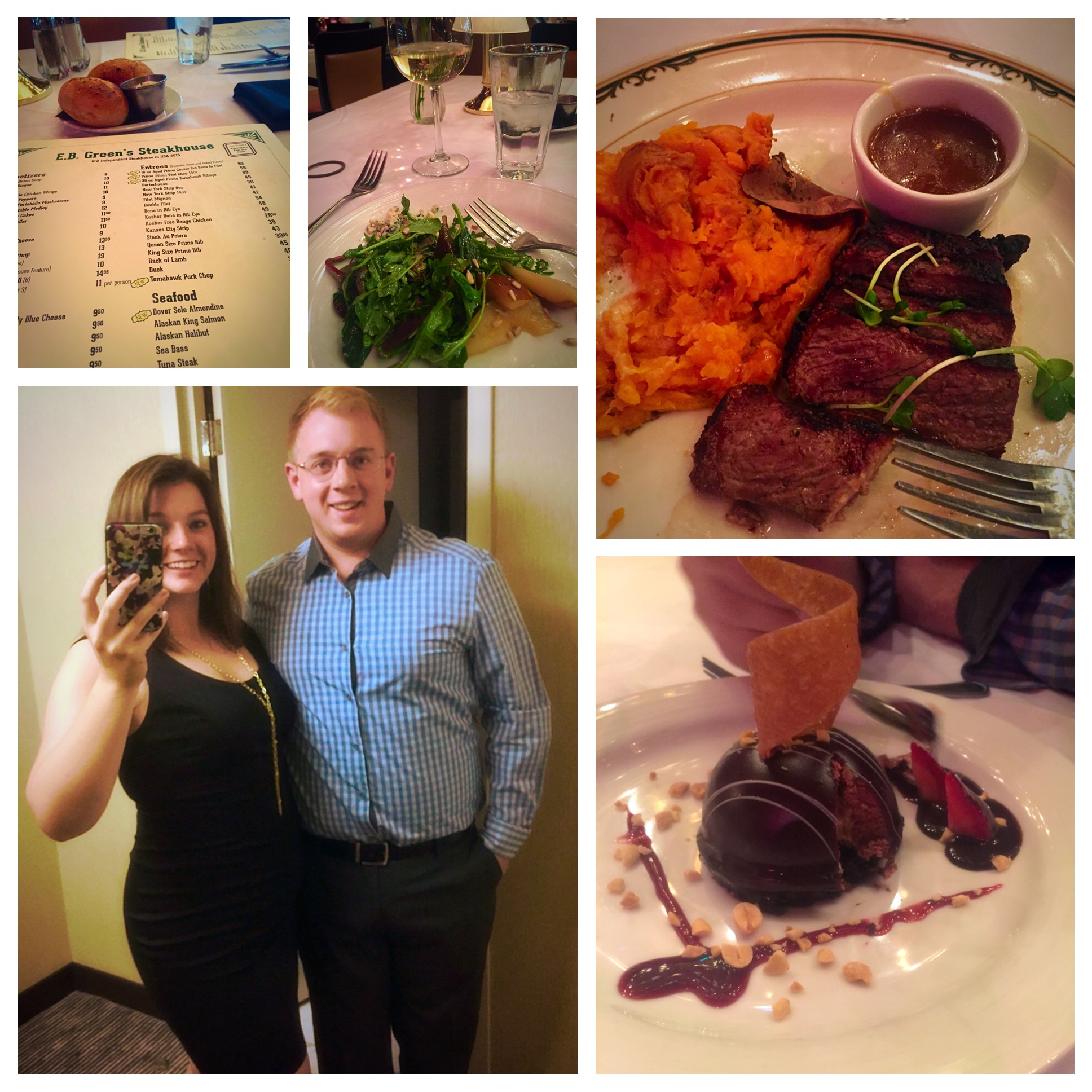 After a quick nap and shower Chris and I had an absolutely amazing dinner at EB Greens Steakhouse. We don’t go out on these fancy dates so it was so much fun to get dressed up and have a delicious meal with each other. We laughed about our fancy dinner etiquette (or lack there of), we had a great time and our waitress was excellent. Towards the end of our dinner there were a few groups of people who came in dressed down and casual that kind of brought the fancy level down a few points, but we were finishing up so it ended up being fine.