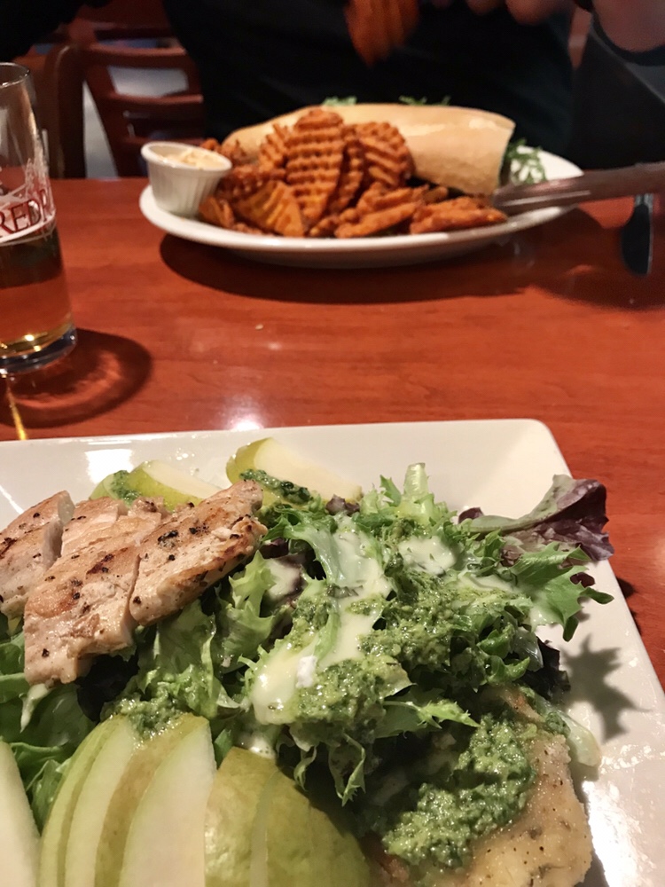 Dinner was this delicious warm goat cheese salad with mixed greens and pear. Yum. Chris had a short rib sandwich with sweet potato waffle fries.