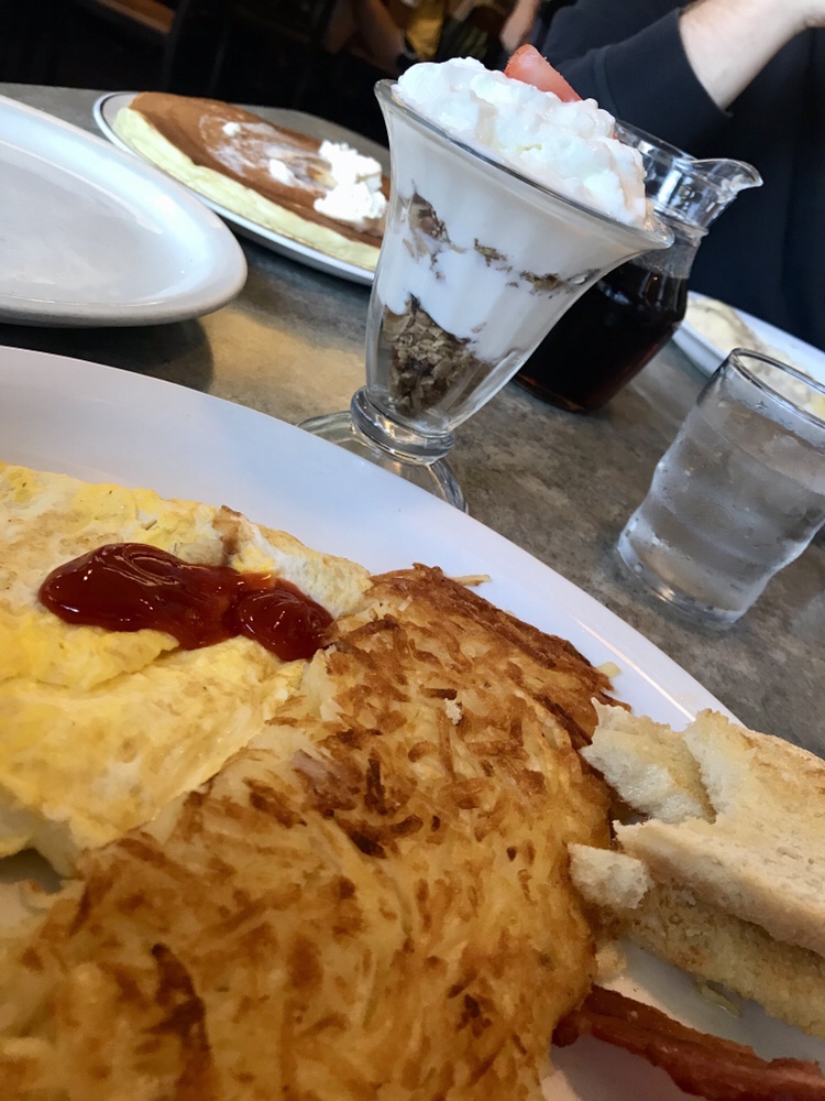 We were expecting some small breakfast options but that was not the case. Chris chose the half order of sausage gravy and biscuits which did not seem like a half portion at all. They made their own bread so this sourdough toast was unreal. And a yogurt parfait to top it all off. It’s safe to say we were full until our next meal at about 4.