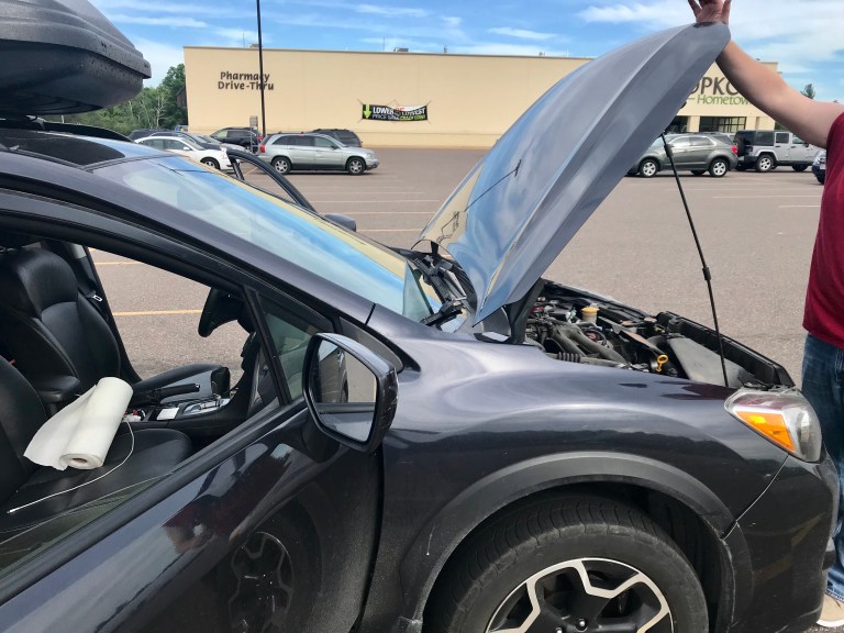 I checked the oil and oil level and it was definitely lower. This girl has got over 113,000 miles on her these days and is absolutely killing it. We let Subie cool down for a few minutes and took the time to re-arrange some things in the car.